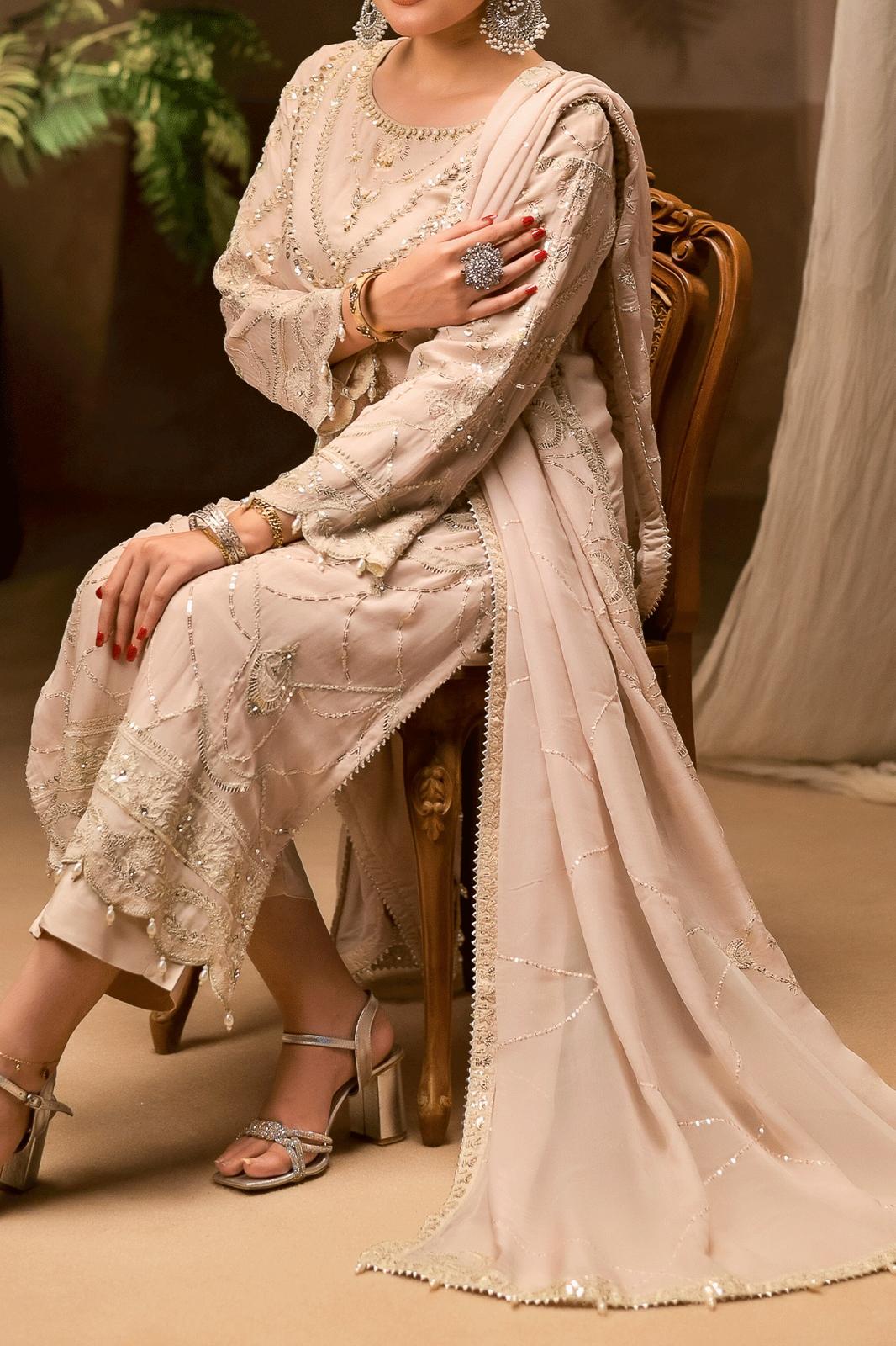 Immerse yourself in the timeless beauty with this exquisite chiffon ensemble, adorned with intricate patterns and embroidery with thread zari and sequins, this ensemble exudes a sense of sophistication and charm, composition adds depth to the design. This ensemble is a tribute to style and elegance, perfect for those who wish to embrace the richness of fashion with a touch of sophistication