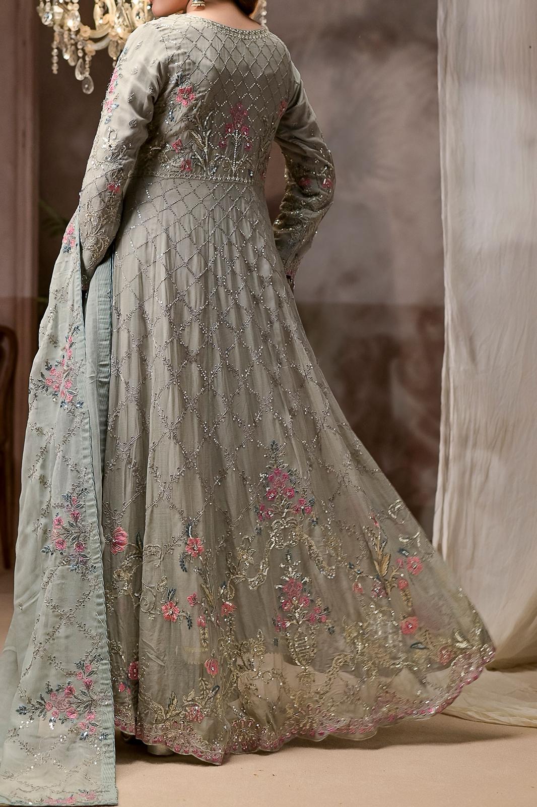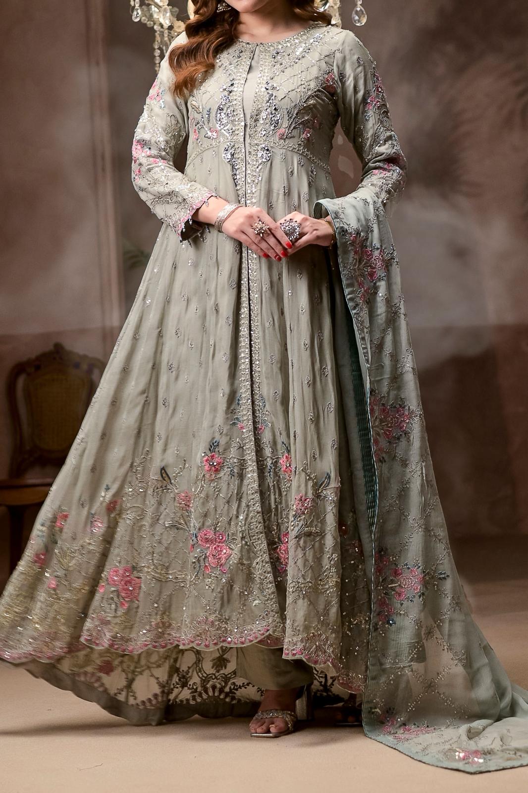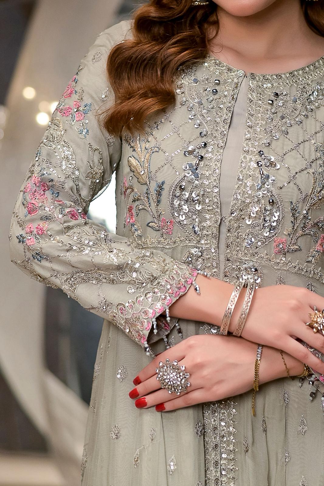 This stunningly attractive article comes with smooth embroidery, a blend of style, and elegance. Floral, geometrical designs and fine embroidery on this dress make it an exquisite choice for any occasion. This maxi achieves a final glamorous appearance when paired with straight trousers and a delicate chiffon dupatta in the same color. Embroidery with sequins and zari enhances its charm and glamour to complete the magnificent look.