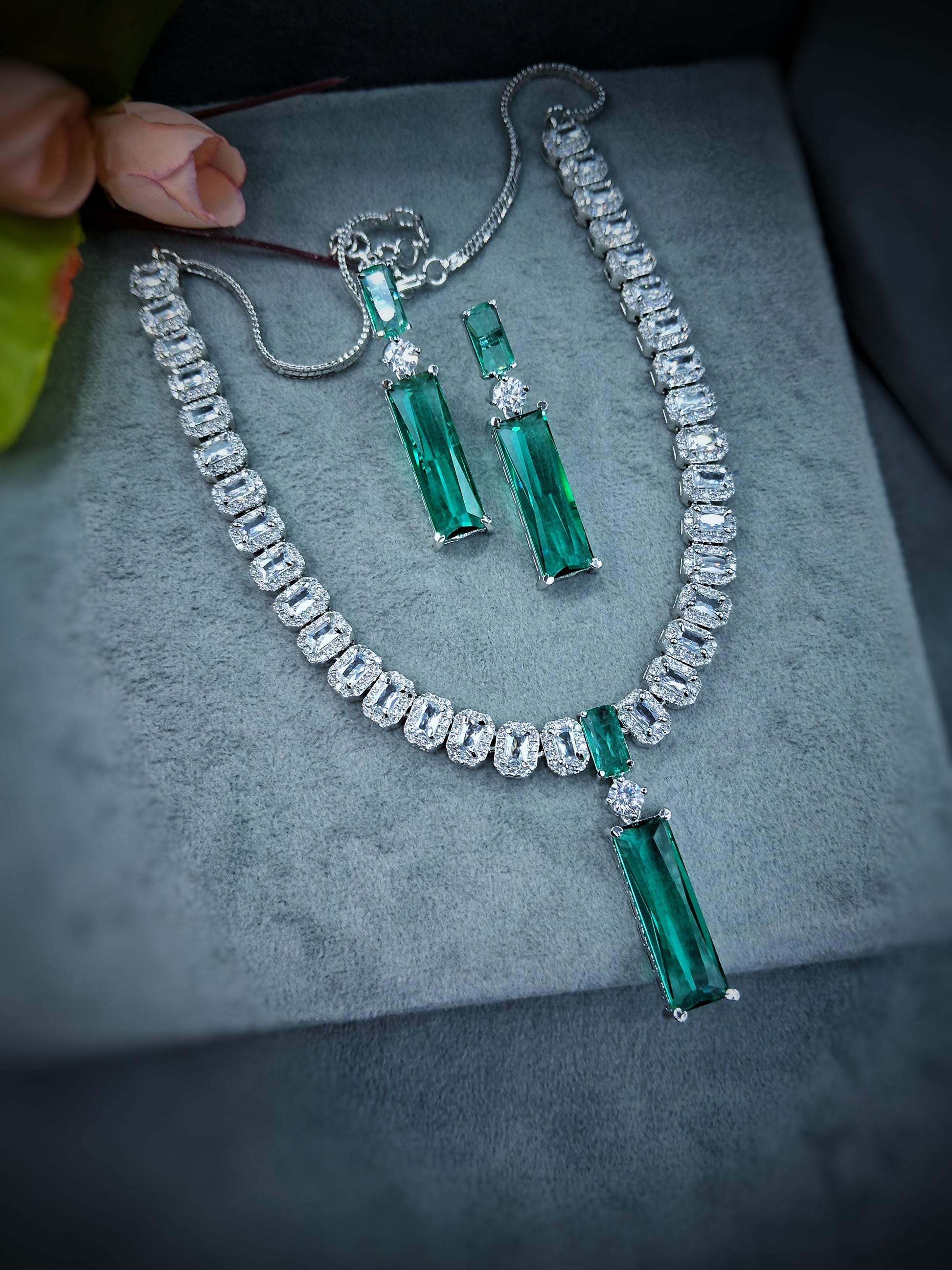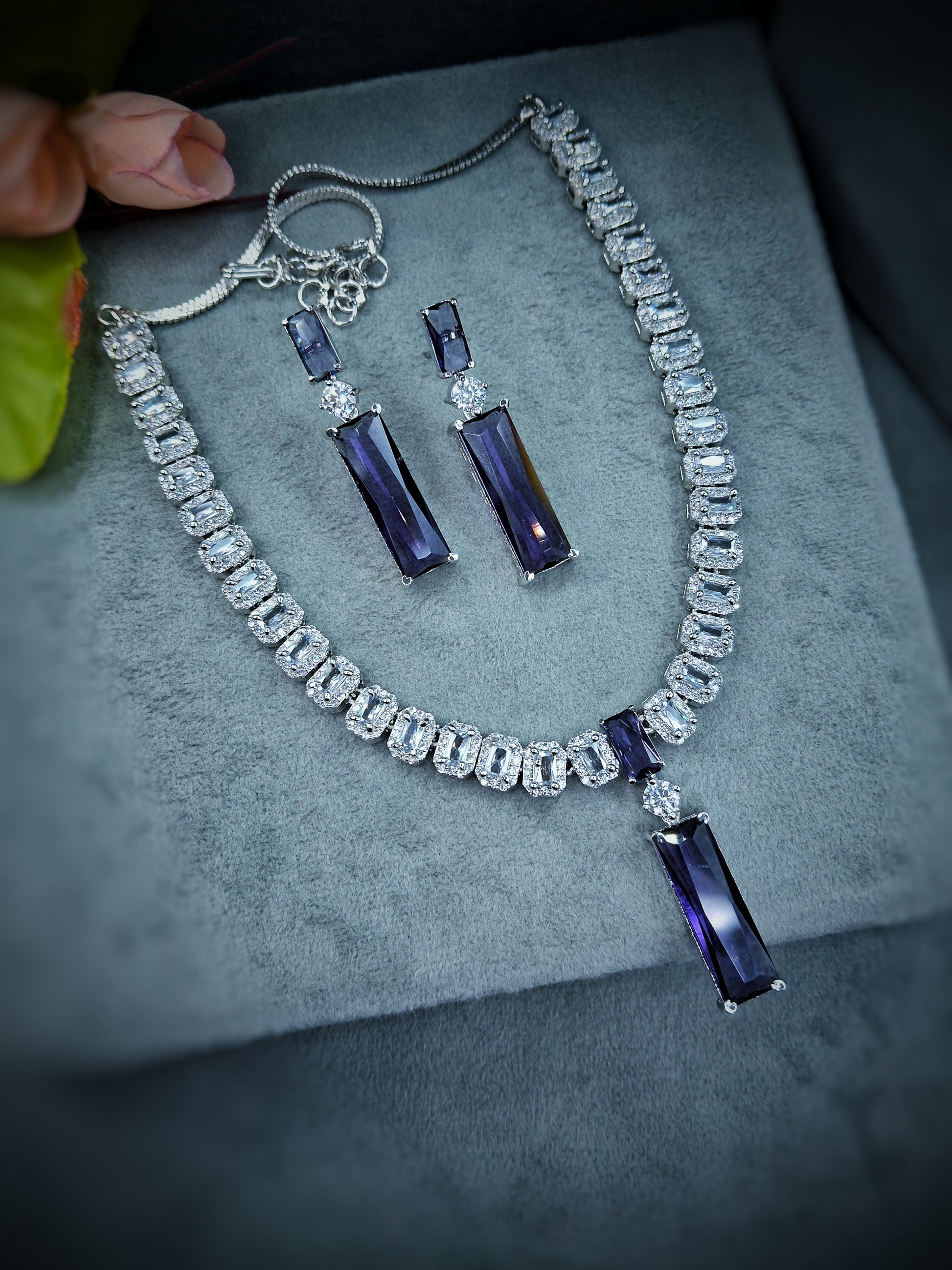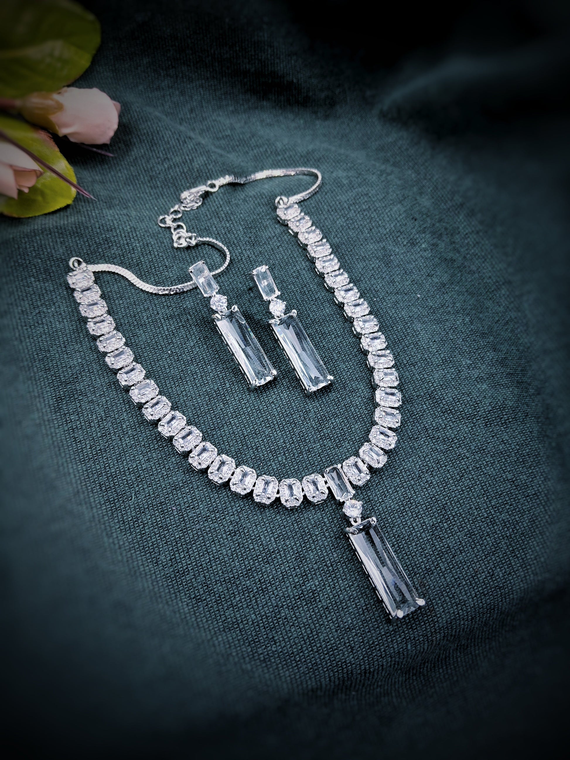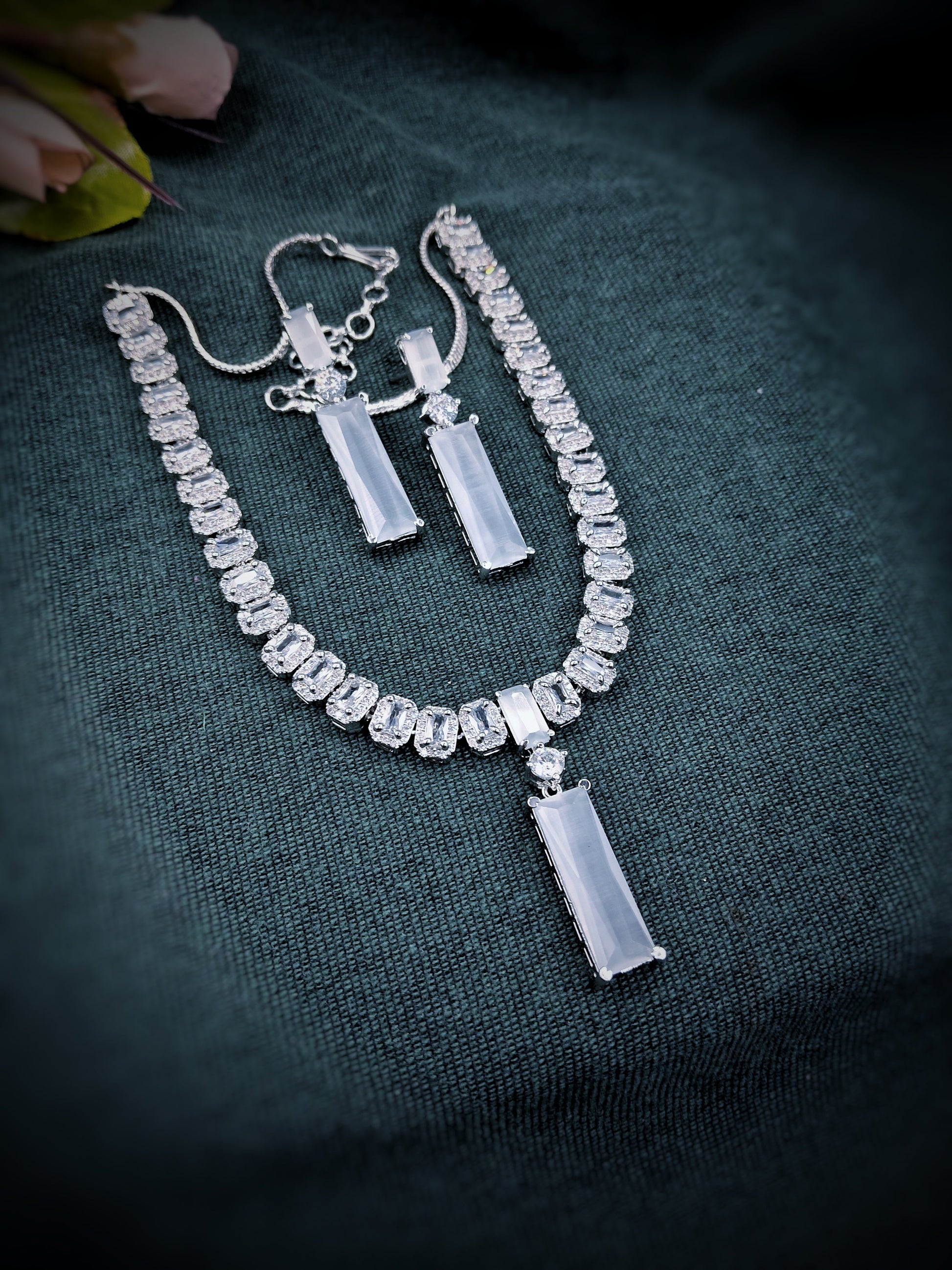 Item -CZ or American Diamond, Silver Color Finished Necklece Set, Plating - White Rhodium Plated, Color Stones