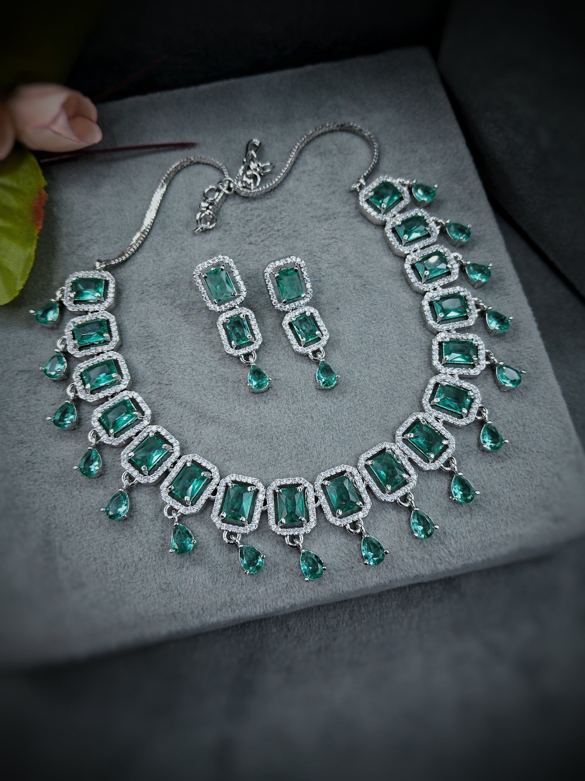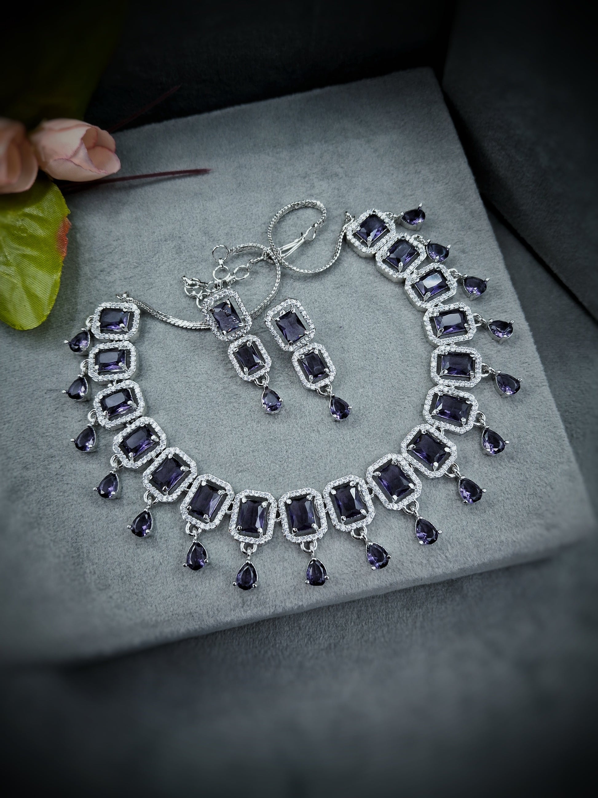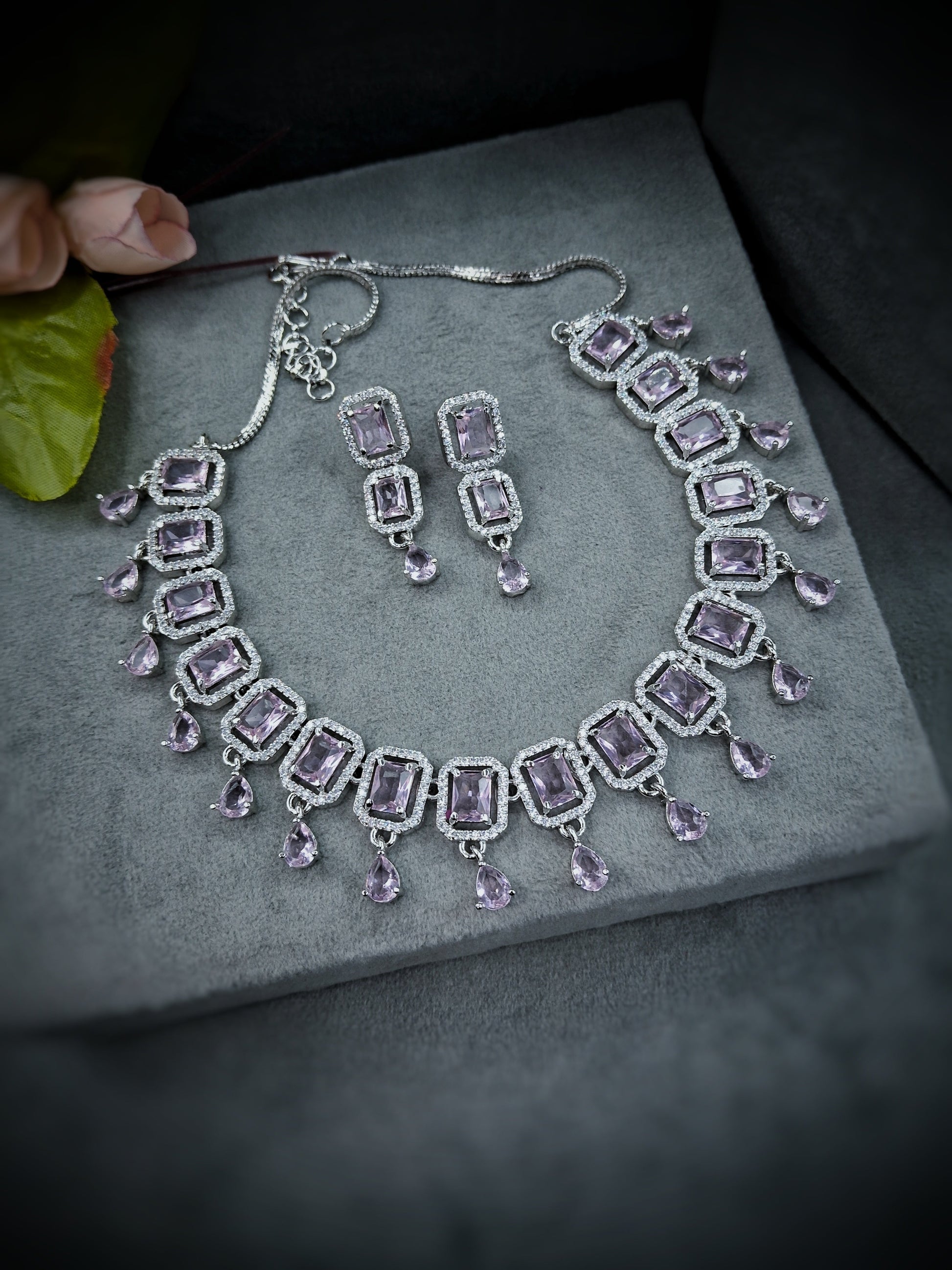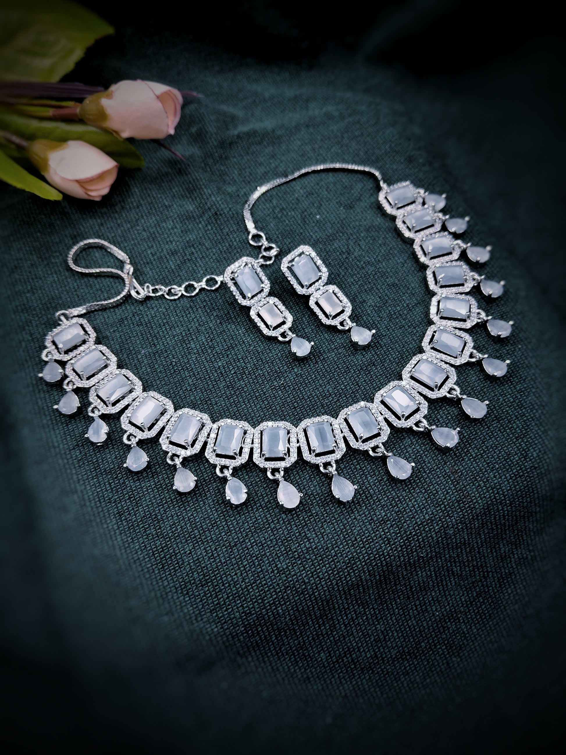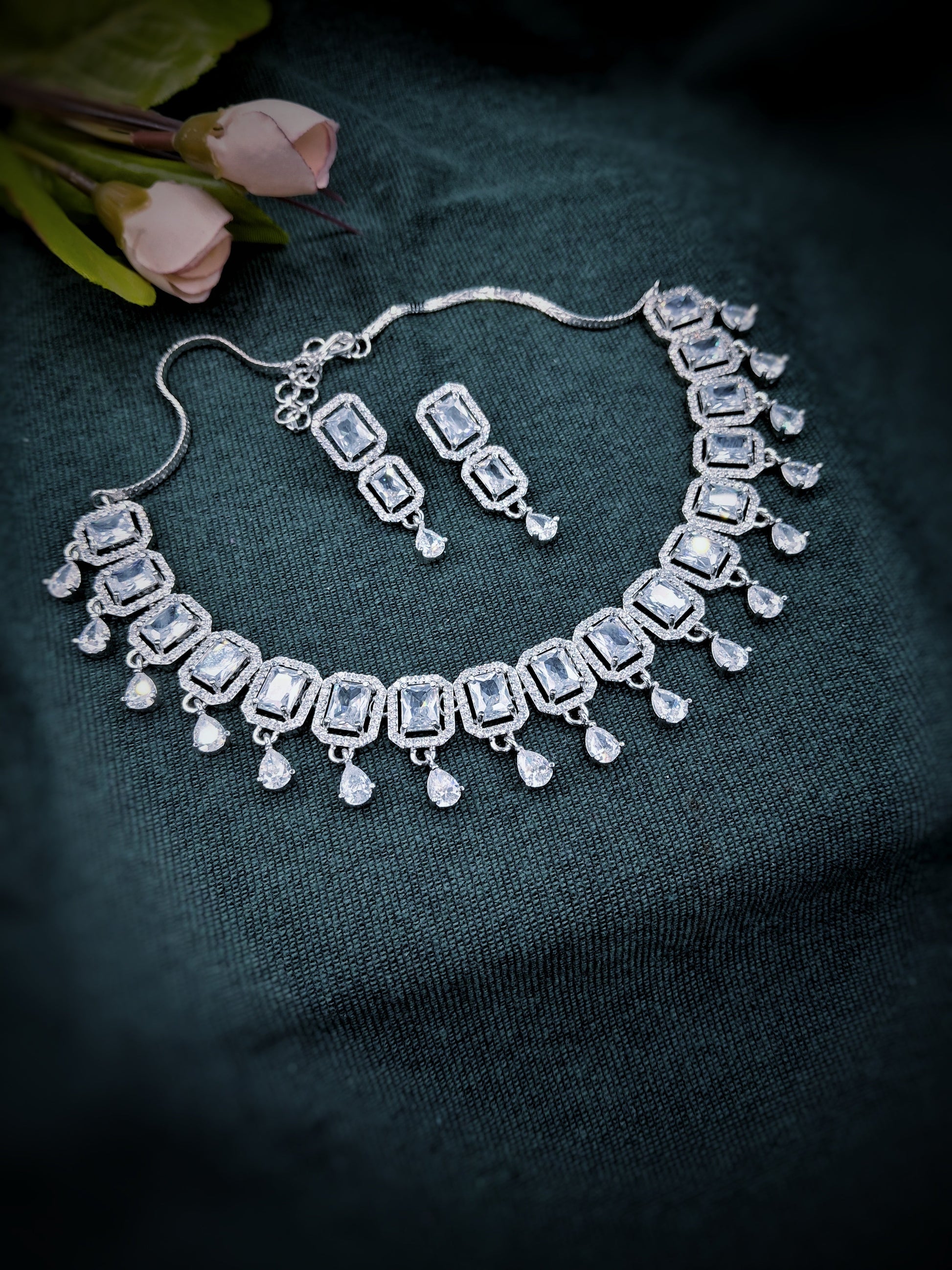 Item -CZ or American Diamond, Silver Color Finished Necklece Set, Plating - White Rhodium Plated, Color Stones -