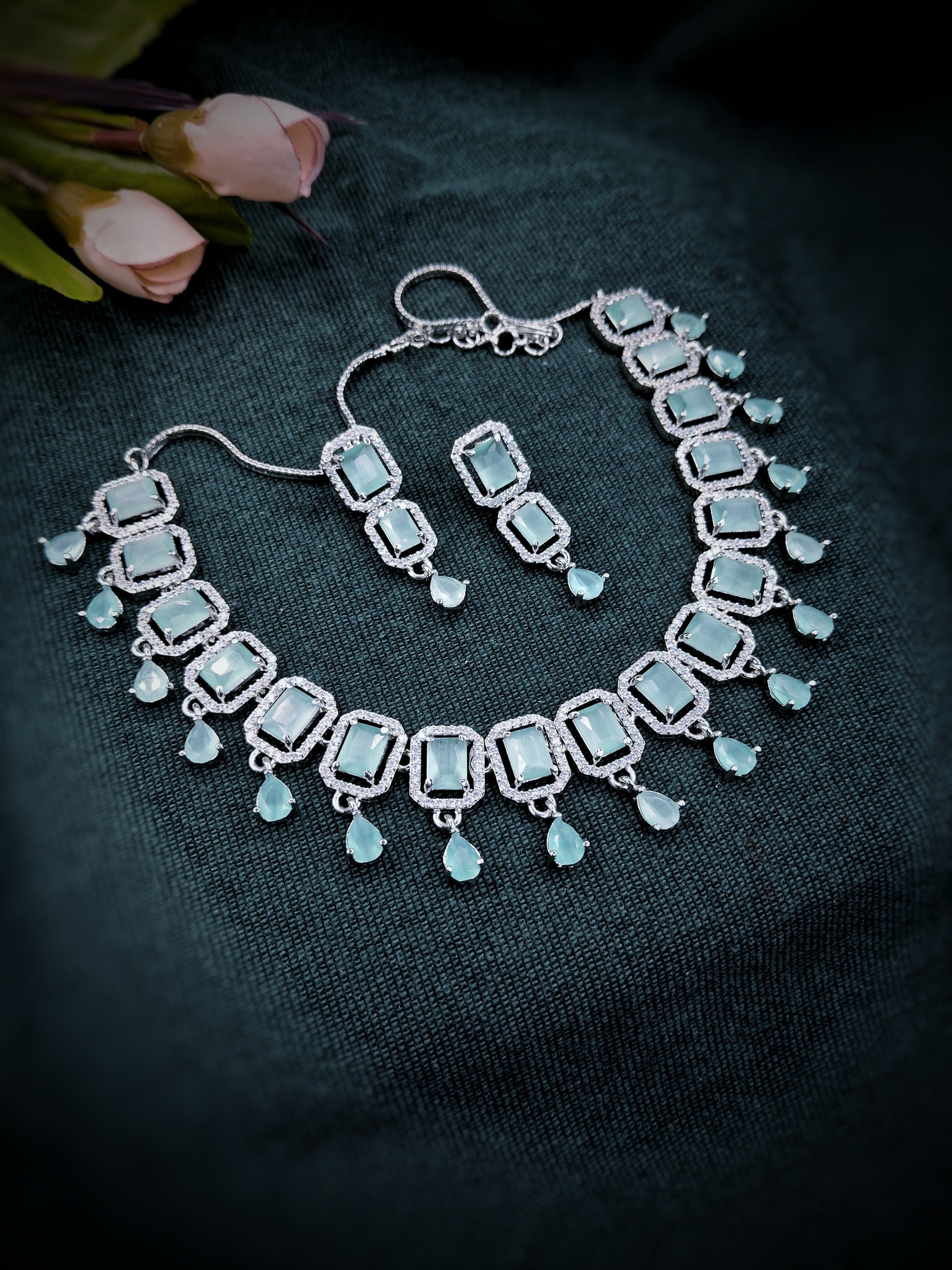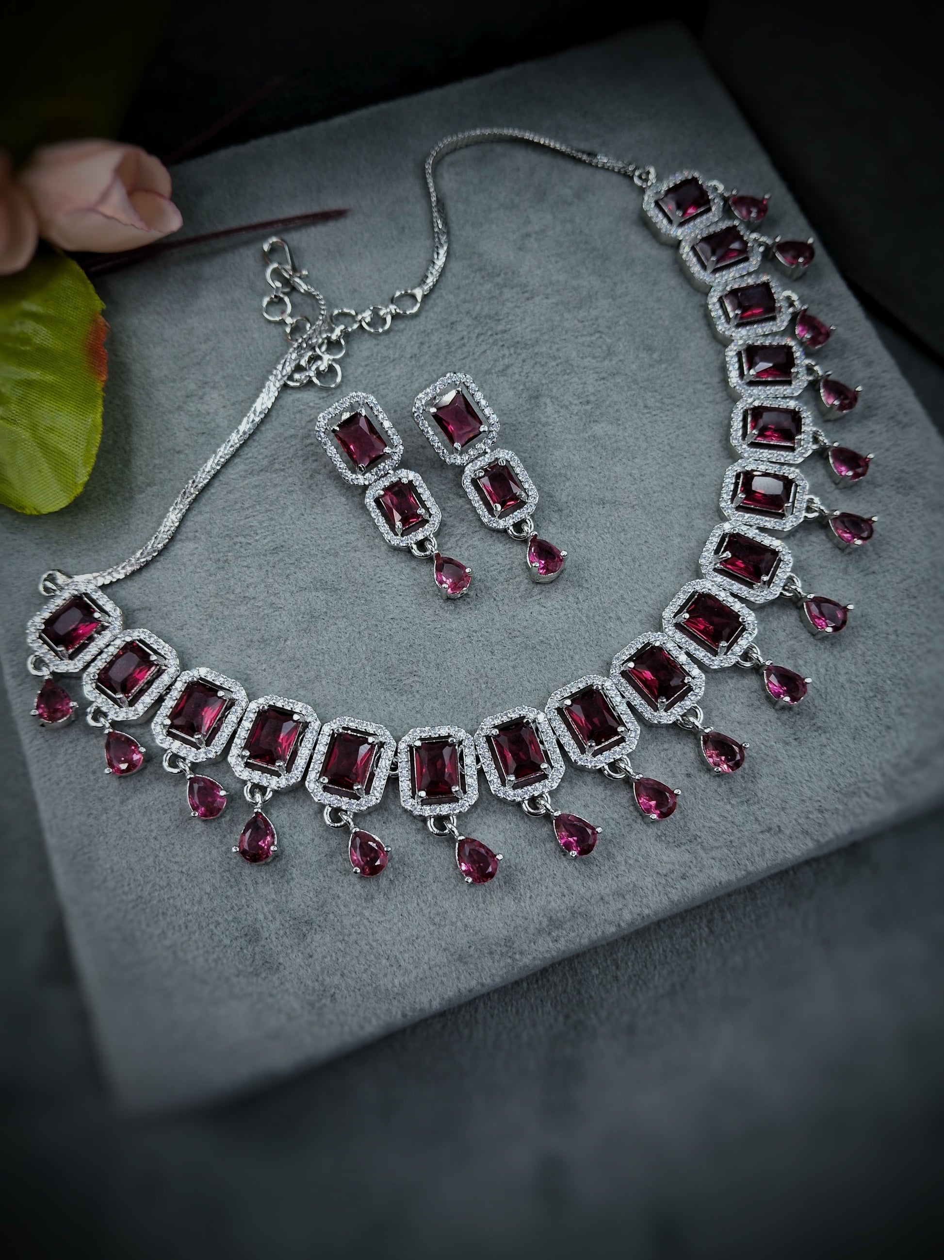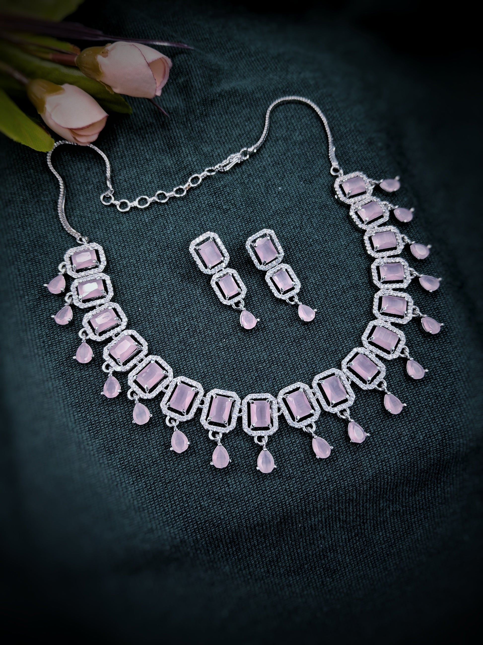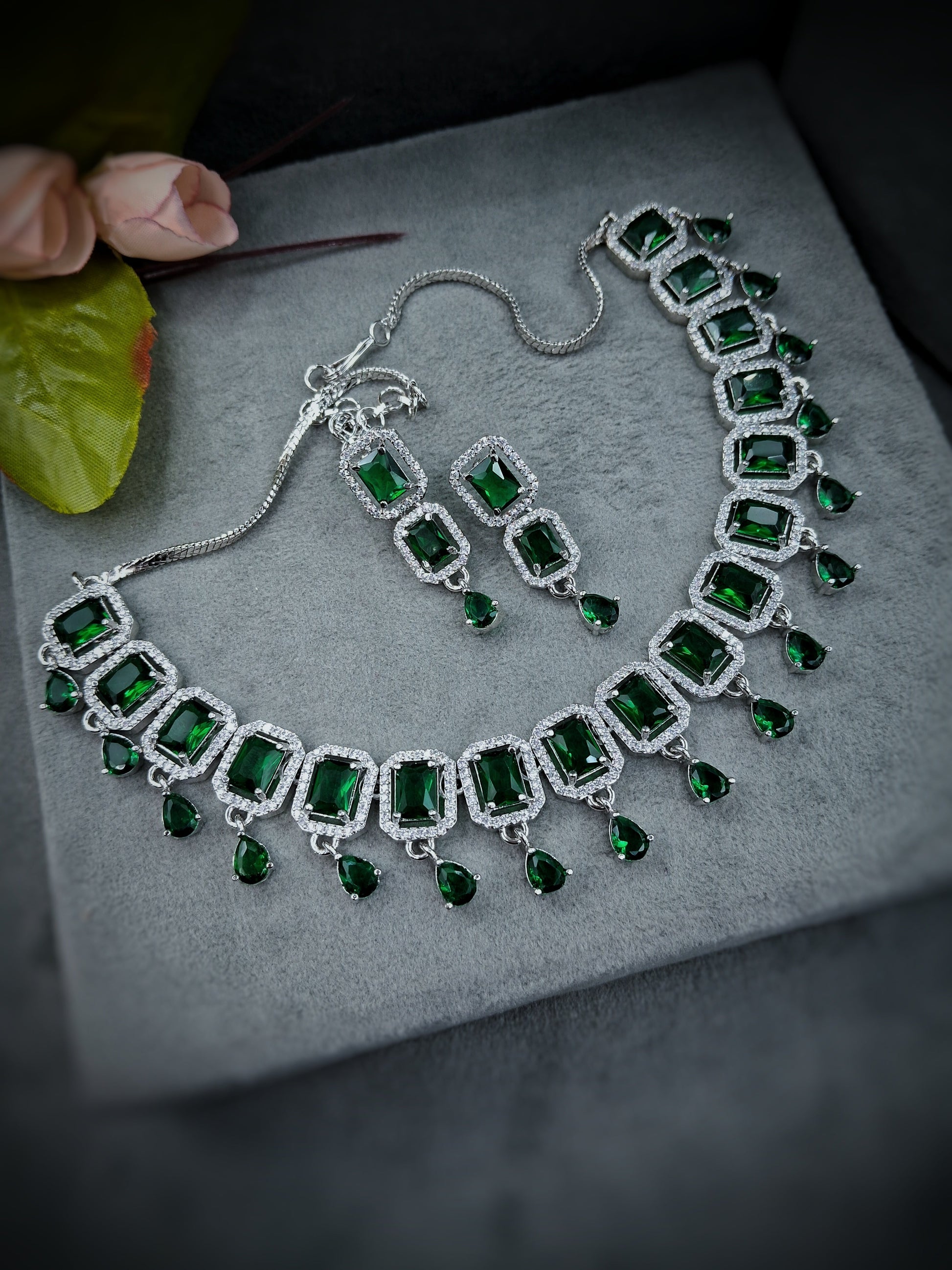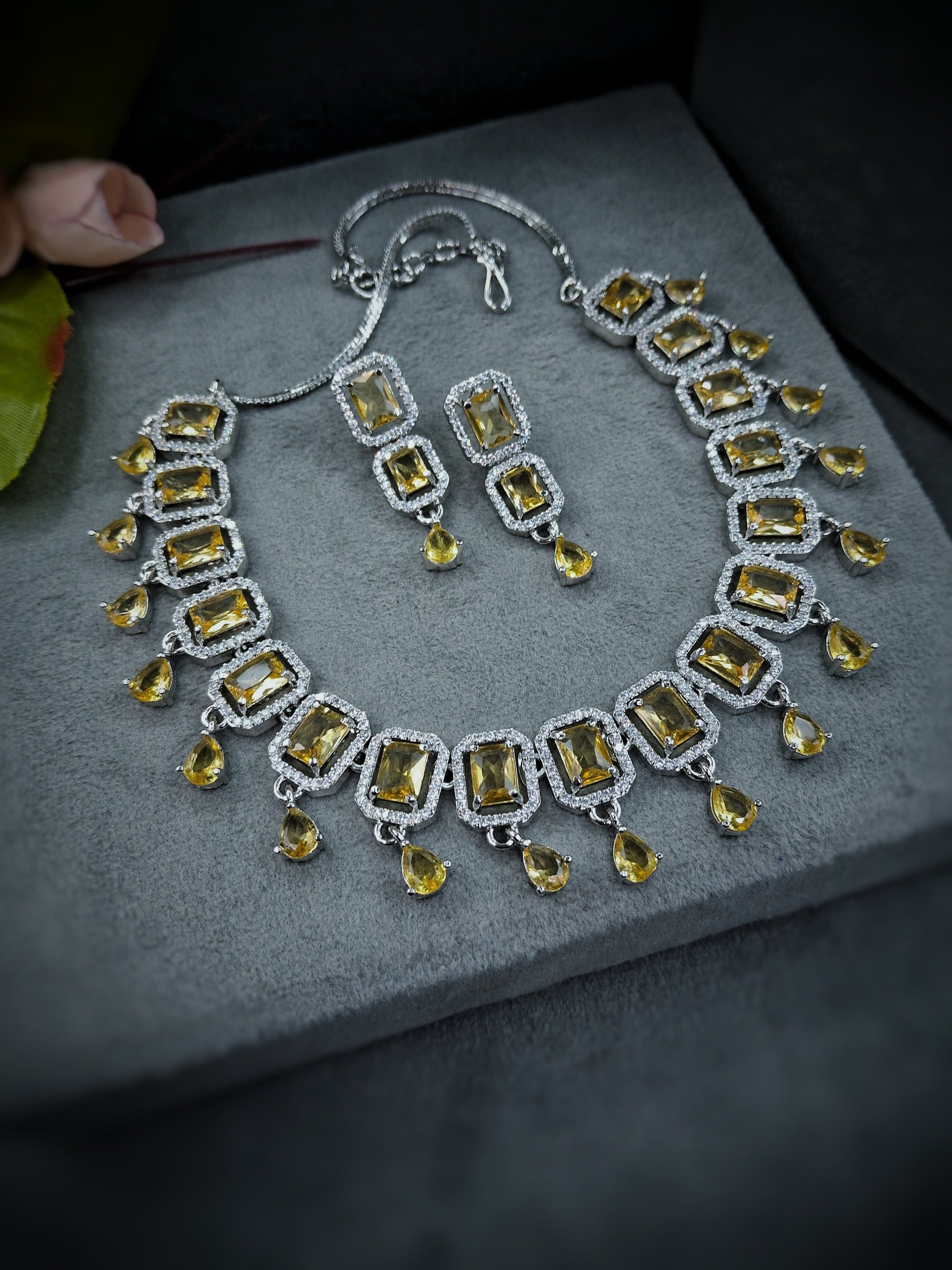 Item -CZ or American Diamond, Silver Color Finished Necklece Set, Plating - White Rhodium Plated, Color Stones -