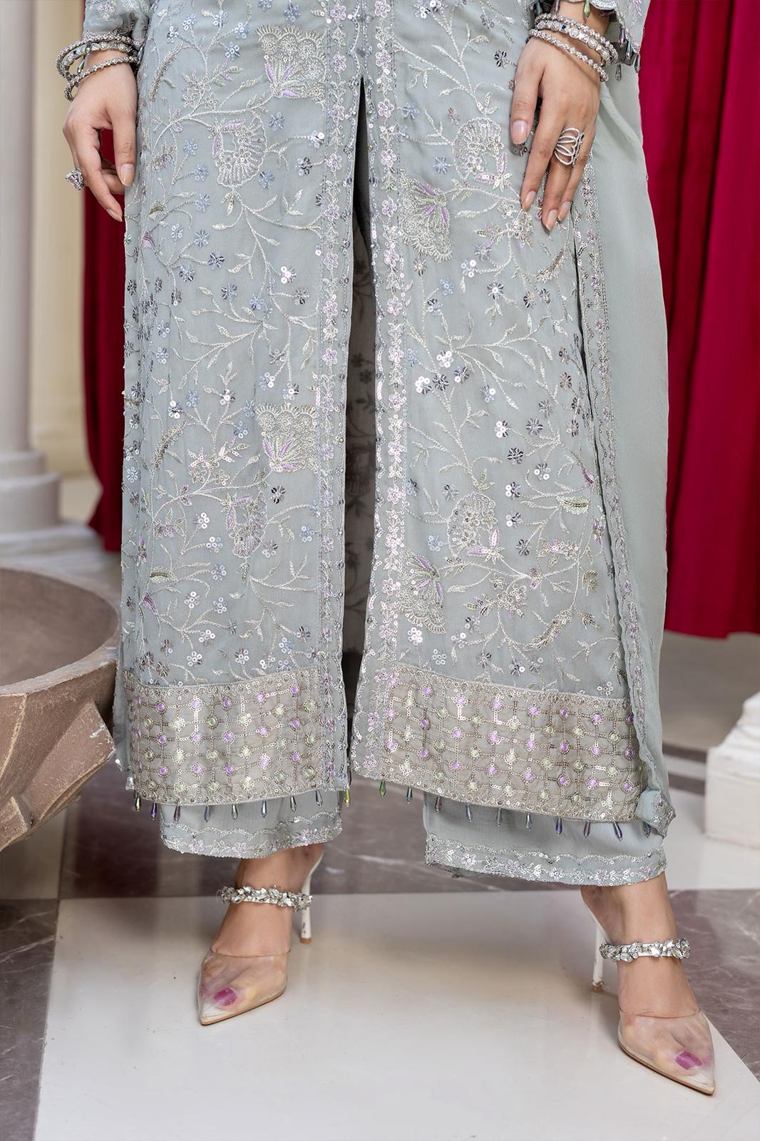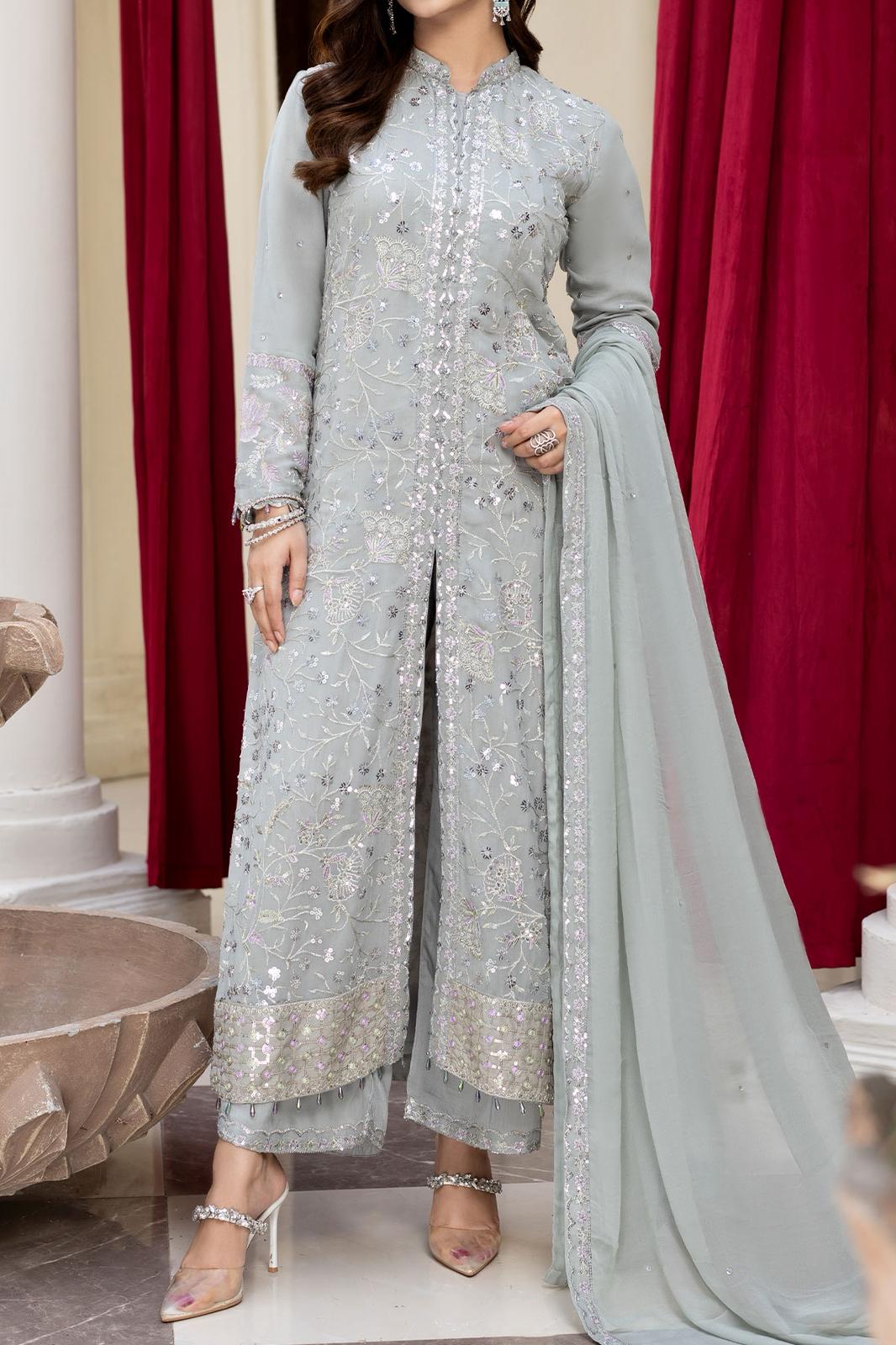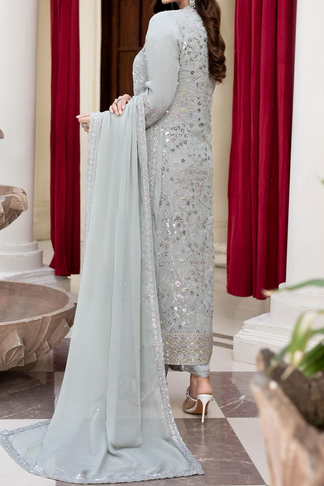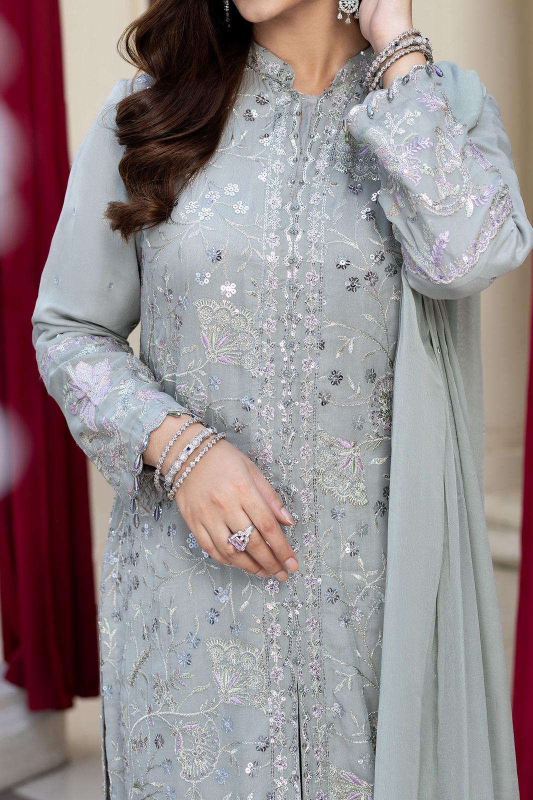 Description: Immerse yourself in the timeless beauty with this exquisite grey ensemble, adorned with intricate patterns and embroidery with thread zari and sequins, this ensemble exudes a sense of sophistication and charm. The all-over jaal adorns the upper chiffon, while the pattern adds depth to the design. This ensemble is a tribute to style and elegance, perfect for those who wish to embrace the richness of fashion with a touch of contemporary flair.