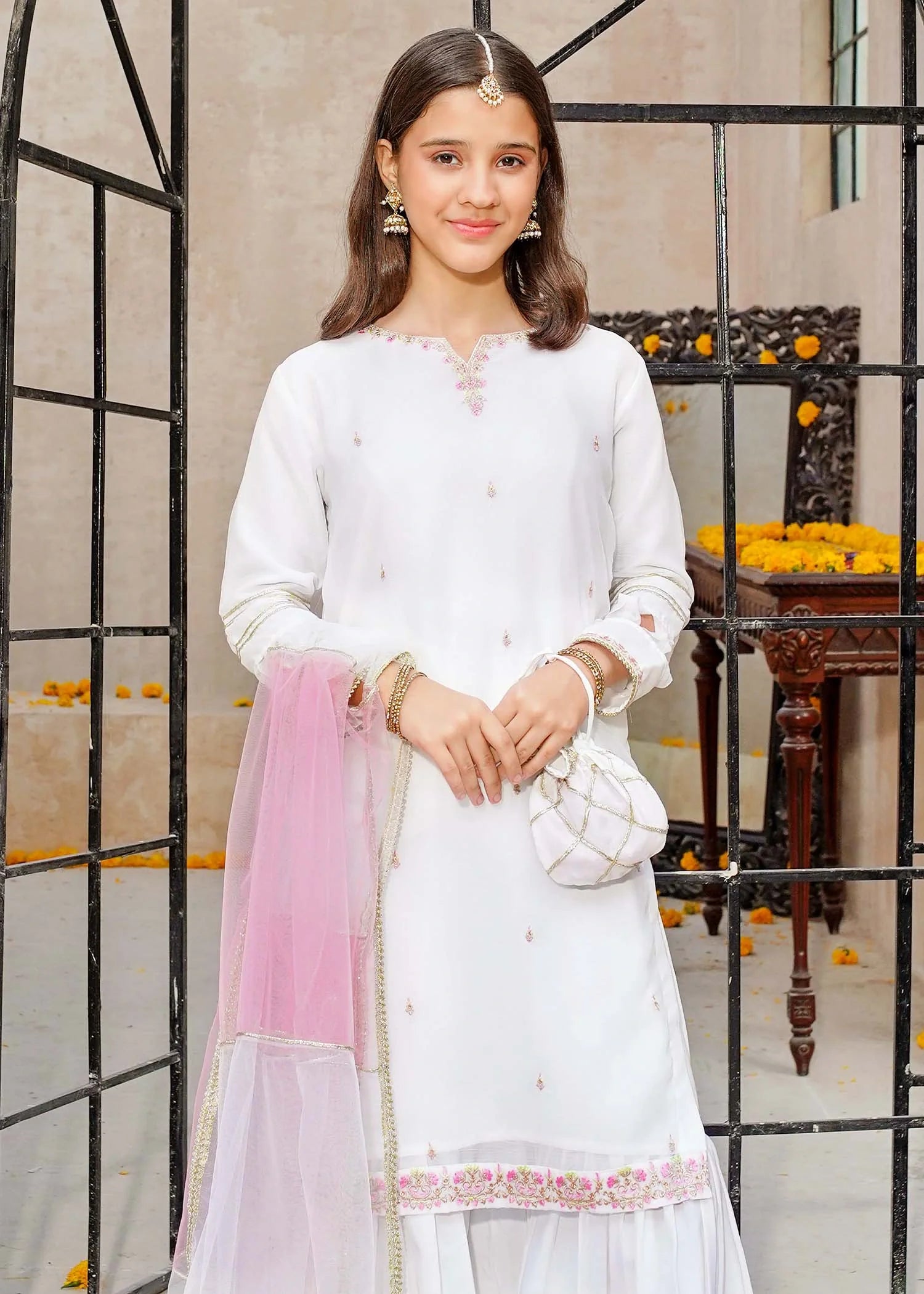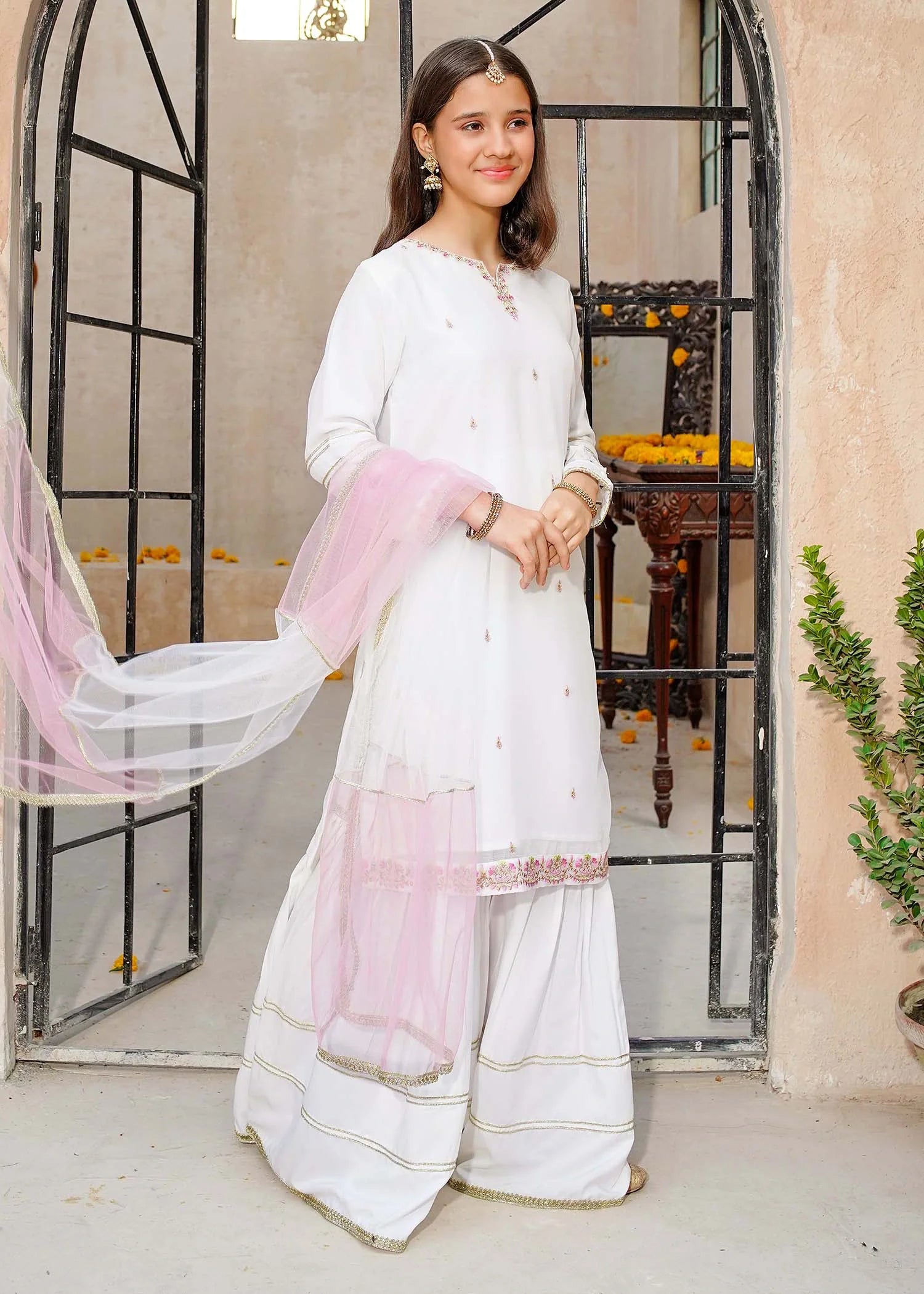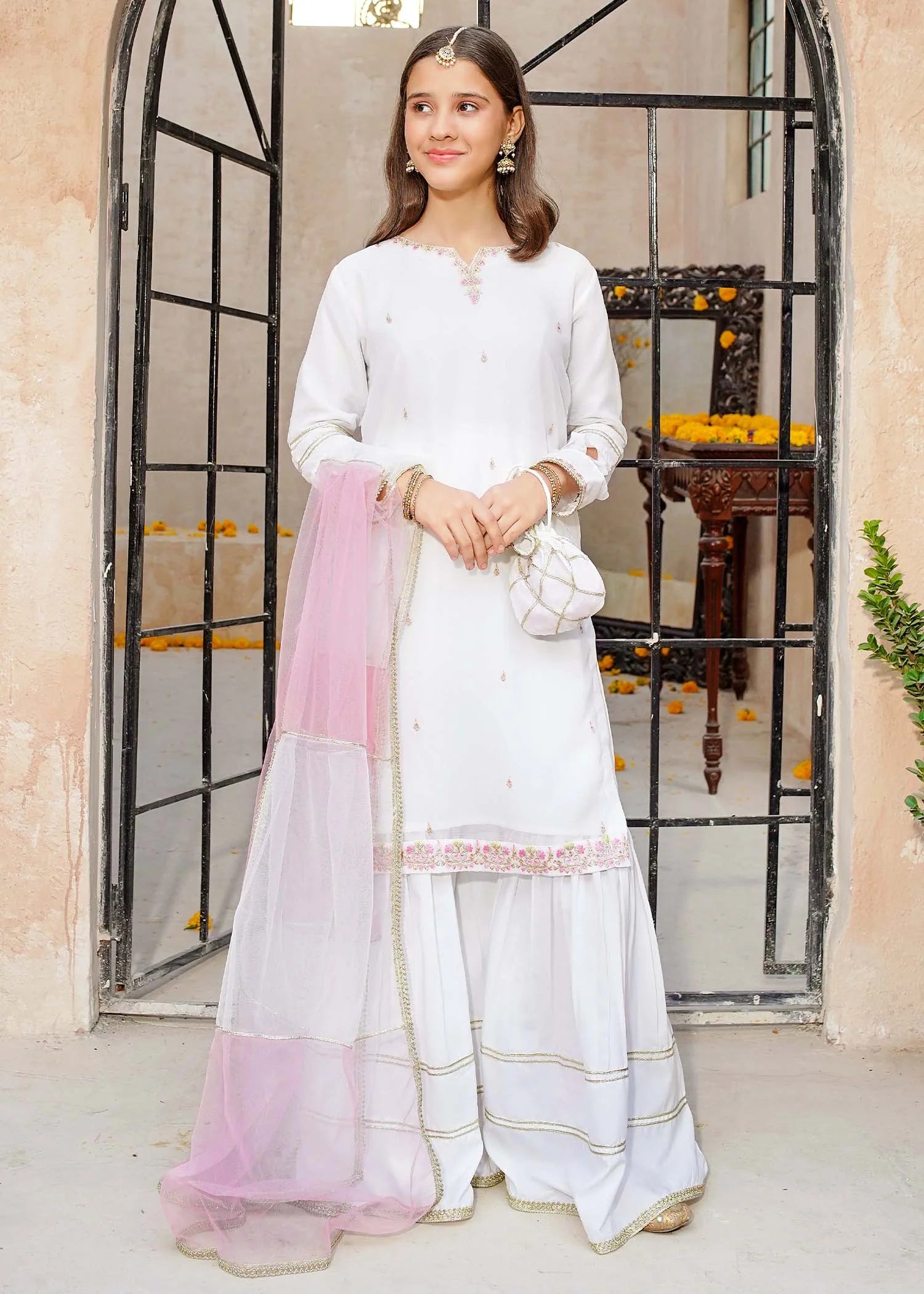 3 Piece White Crinkle Embroidered Gharara